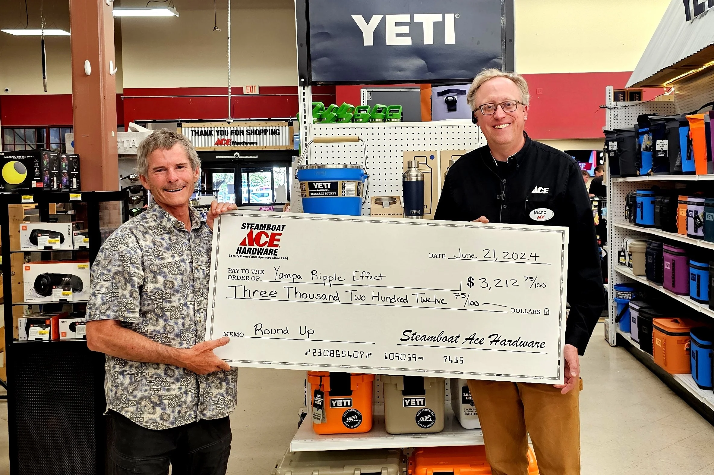 Hats off to Yampa Ripple Effect partner Ace Hardware for joining this year's round-up for the river effort again in 2025! Like last year, the event ran during June and helped raise substantial funds to support the program. Owner Marc Swanson and manager Carl Fitzgerald posed with an oversized donation check along with the Yampa Ripple Effect's Eugene Buchanan and dog Banjo! (Note: Banjo is available for future donation check photos with all partners).